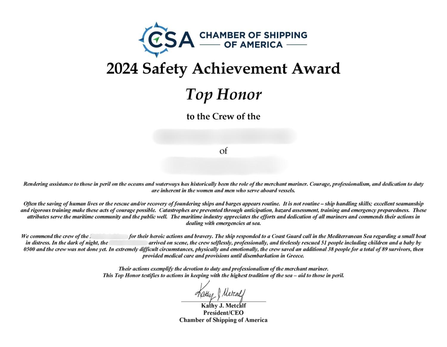 The Ship Safety Achievement Award is one of two safety programs CSA has sponsored since 1968. The award publicly recognizes the skills and dedication of the men and women who are responsible for performing outstanding feats of safety during a calendar year. The award, which is open to CSA members and non-members alike, is presented at the Annual Safety Awards Luncheon, held mid-year in New Orleans.